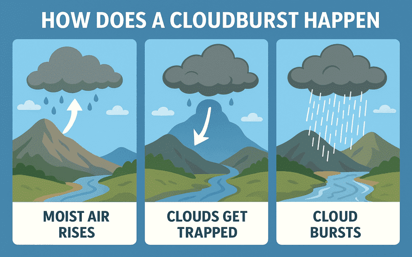 If these clouds get trapped in a narrow valley or cannot move further, the water content builds up inside them. When the clouds can no longer hold the moisture, they burst — unleashing a sudden downpour over a very small area. This is what we call a cloudburst.